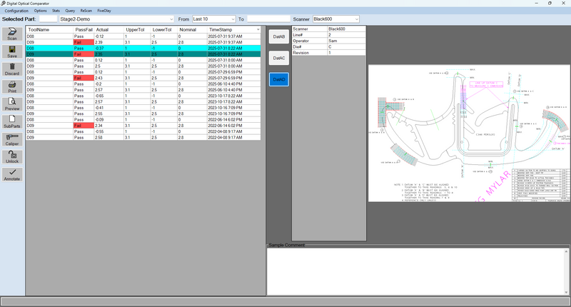 Compare scanned samples against CAD references using multiple alignments, each tailored to inspect different sets of critical features. Visual inspections, operator comments and mark-ups are saved to a central repository for easy access.